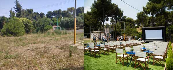 Πιο συγκεκριμένα, οι εργασίες περιλάμβαναν, πέραν της εγκατάστασης του οπτικοακουστικού εξοπλισμού (οθόνη προβολής, projector, ηχεία), την τοποθέτηση ειδικού χλοοτάπητα και τραπεζοκαθισμάτων, ενώ έγινε και διακόσμηση περιμετρικά του χώρου με φυτά και φαναράκια. Μία συλλογή ταινιών για όλες τις ηλικίες, καθώς και μηχανή pop corn, προσφέρθηκαν για να κάνουν ακόμη πιο ευχάριστη την κινηματογραφική εμπειρία των παιδιών.