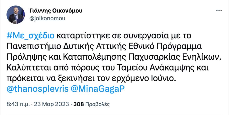 Τον ερχόμενο Ιούνιο θα ξεκινήσει το Εθνικό Πρόγραμμα Πρόληψης και Καταπολέμησης Παχυσαρκίας Ενηλίκων, με χρηματοδότηση από το Ταμείο Ανάκαμψης, όπως σημειώνει σε ανάρτηση στο twitter ο κυβερνητικός εκρόσωπος, Γιάννης Οικονόμου. Πρόκειται για ένα πρόγραμμα, το οποίο καταρτίστηκε σε συνεργασία με το Πανεπιστήμιο Δυτικής Αττικής.