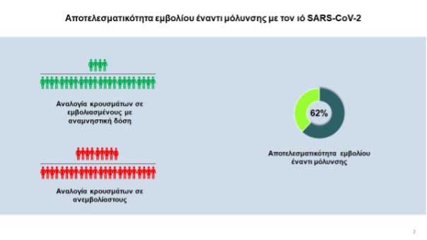 Η αποτελεσματικότητα του εμβολίου (αναμνηστική δόση) έναντι μόλυνσης SARS-CoV-2 εκτιμήθηκε σε 62%, σε σχέση με τους ανεμβολίαστους ή μερικώς εμβολιασμένους