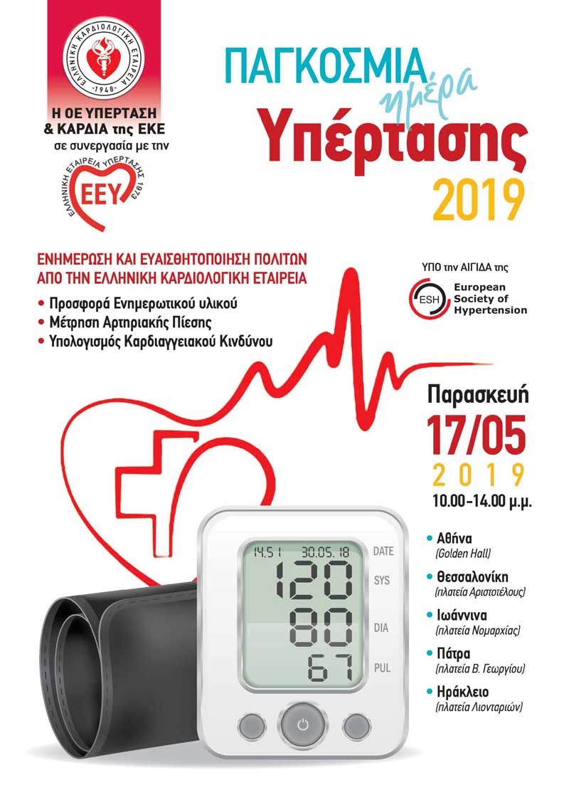 - Παγκόσμια Ημέρα Αρτηριακής Υπέρτασης – 17 Μαΐου: Παράλληλη ενημέρωση για Αρτηριακή Υπέρταση και Καρδιακή Ανεπάρκεια με Περίπτερα, στις 17 Μαΐου 2019 (ώρες 10.00-14.00) σε Αθήνα (Golden Hall), Θεσσαλονίκη (Πλατεία Αριστοτέλους), Ιωάννινα (πλατεία Πύρρου), Πάτρα (πλατεία Βασιλέως Γεωργίου), Ηράκλειο (πλατεία Λιονταριών), Πειραιά (Πλατεία Κοραή). Θα διατίθεται σύντομο ερωτηματολόγιο γνώσεων ασθενών προς συμπλήρωση, προσφορά ενημερωτικού υλικού και υπολογισμός καρδιαγγειακού κινδύνου.