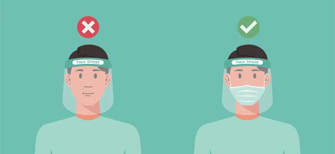 Επιπλέον, όπως αναφέρεται και στη σχετική (7) εγκύκλιο μας οι ασπίδες προσώπου (face shields) προσφέρουν χαμηλότερο βαθμό προστασίας από τη μάσκα όσον αφορά την πρόληψη της μετάδοσης σταγονιδίων. Ως εκ τούτου, οι ασπίδες προσώπου δεν ισοδυναμούν με μάσκα και η χρήση τους γίνεται συμπληρωματικά με τις μάσκες προστασίας. Εάν πρόκειται να χρησιμοποιηθούν ασπίδες προσώπου, πρέπει να διασφαλιστεί η σωστή σχεδίαση που καλύπτει τις πλευρές του προσώπου και κάτω από το πηγούνι καθώς και ο επαρκής καθαρισμός και απολύμανσή τους. Ασπίδες, που καλύπτουν μερικώς το πρόσωπο ή μόνο το στόμα και την μύτη (mouth shields) θα πρέπει να αποκλείονται γιατί δεν προσφέρουν προστασία ούτε στον χρήστη ούτε σε άλλο άτομο και δεν θεωρούνται ότι αποτελούν μάσκα προστασίας.