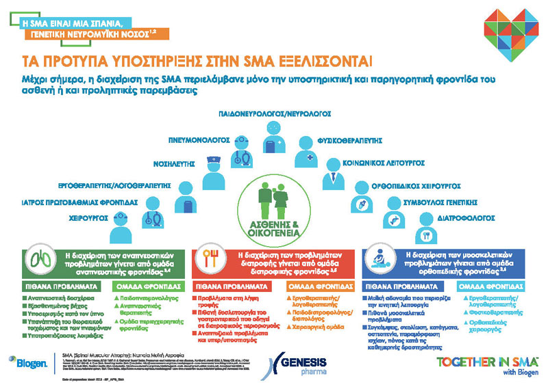 Επιπλέον, έκανε λόγο και για την πραγματοποίηση ενός εκ των μεγαλύτερων δωρεάν προεγκριτικών Προγραμμάτων Εκτεταμένης Πρόσβασης για σπάνια νοσήματα (EAP), το 2016, σε 18 ευρωπαϊκές χώρες, με τη χορηγία της Biogen, με στόχο την επείγουσα θεραπευτική αντιμετώπιση των ασθενών με βαριά εκδήλωση της νόσου (SMA Τύπου 1), στο οποίο συμμετείχαν περισσότεροι από 540 ασθενείς και πρόσθεσε: «Στην Ελλάδα, χάρη στη συνεργασία όλων των φορέων, καταφέραμε ώστε 6 παιδιά με τη βαρύτερη μορφή της νόσου, να λάβουν τη θεραπεία δωρεάν, στο πλαίσιο ομαδικού προγράμματος πρώιμης πρόσβασης της GENESIS Pharma. Σήμερα υπολογίζουμε ότι 25 περίπου ασθενείς στη χώρα μας λαμβάνουν τη θεραπεία με Nusinersen, σε 5 κέντρα στην Αθήνα, τη Θεσσαλονίκη και την Κρήτη».