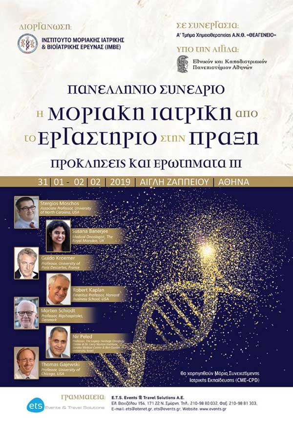 Οι νεότερες εξελίξεις και εφαρμογές της Μοριακής Ιατρικής αποτελούν το θέμα Πανελληνίου Συνεδρίου, με θέμα «Η Μοριακή Ιατρική από το εργαστήριο στην πράξη – Προκλήσεις και Ερωτήματα ΙΙΙ», το οποίο θα διεξαχθεί 31 Ιανουαρίου 2019 έως 2 Φεβρουαρίου, στην Αίγλη Ζαππείου. Το συνέδριο διοργανώνεται από το Ινστιτούτο Μοριακής Ιατρικής και Βιοϊατρικής Έρευνας (ΙΜΒΕ), σε συνεργασία με το Α’ Τμήμα Χημειοθεραπείας του Α.Ν.Θ. Θεαγένειο, και τελεί υπό την αιγίδα της Ιατρικής Σχολής του ΕΚΠΑ.