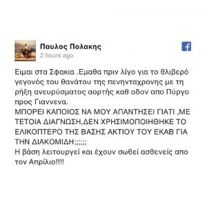 Σε ανάρτησή του στο facebook ο Παύλος Πολάκης αναρωτήθηκε γιατί δεν χρησιμοποιήθηκε ελικόπτερο για την αεροδιακομιδή της 52χρονης, προκαλώντας την άμεση αντίδραση του υπουργού.