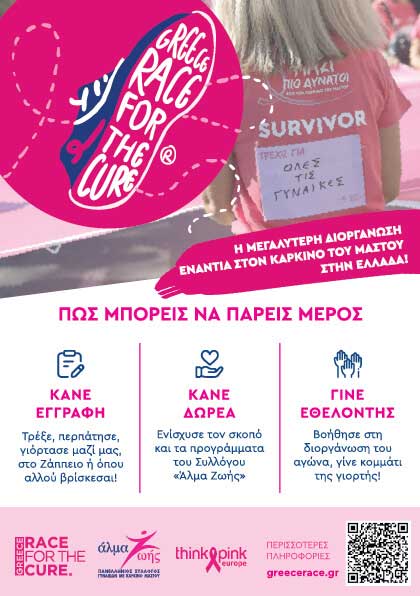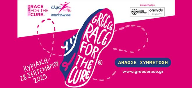 Την Κυριακή 28 Σεπτεμβρίου, το Greece Race for the Cure® μάς φέρνει για 17η χρονιά κοντά, για έναν κοινό σκοπό: τον αγώνα ενάντια στον καρκίνο του μαστού. Με σύνθημα «Μαζί πιο δυνατοί από τον καρκίνο του μαστού», τρέχουμε 5χλμ & περπατάμε 2χλμ ξεκινώντας από το Ζάππειο, ή συμμετέχουμε απομακρυσμένα, μεταφέροντας τα μηνύματα της διοργάνωσης σε κάθε γωνιά της Ελλάδας.