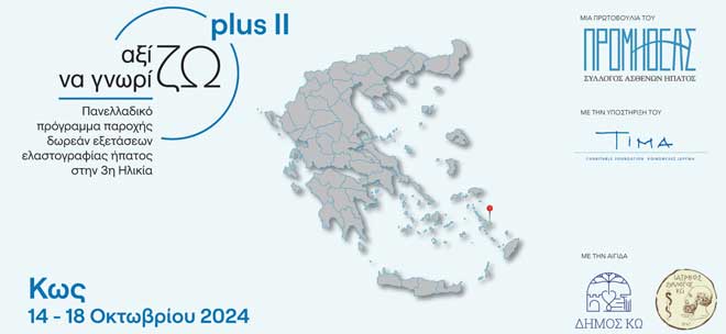 Με τίτλο «Αξίζω να Γνωρίζω Plus ΙΙ» και στόχο τη βελτίωση της υγείας και της ποιότητας ζωής των ανθρώπων Τρίτης Ηλικίας (65+ ετών), ο Σύλλογος Προμηθέας συνεχίζει ακόμα πιο δυναμικά το επιτυχημένο πρόγραμμα παροχής δωρεάν εξετάσεων ελαστογραφίας ήπατος στην Κω.