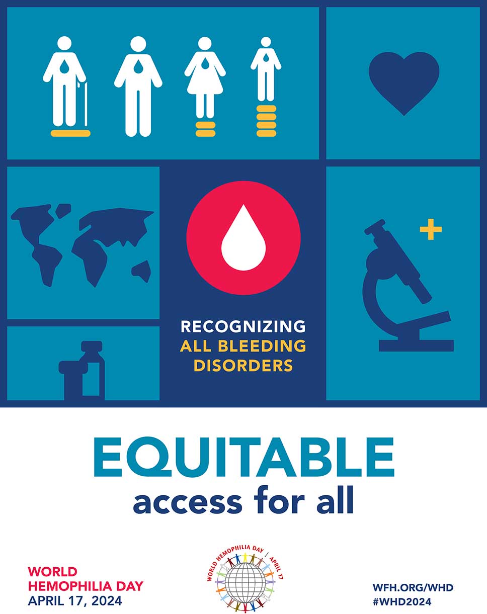 Με αφορμή την Παγκόσμια Ημέρα Αιμορροφιλίας, στις 17 Απριλίου, ο Παγκόσμιος Οργανισμός Αιμορροφιλίας (World Federation of Hemophilia – WFH), στέλνει το μήνυμα «Ισότιμη πρόσβαση για όλους: Αναγνώριση όλων των αιμορραγικών διαταραχών». Με αυτό το μήνυμα θέλει να αναδείξει την αναγκαιότητα εξασφάλισης ισότιμης πρόσβασης των ασθενών σε διάγνωση, νέες καινοτόμες θεραπείες και ολοκληρωμένη φροντίδα, ανεξάρτητα από τον τύπο της αιμορραγικής διαταραχής, το φύλο, την ηλικία ακόμα και τον τόπο διαμονής τους.