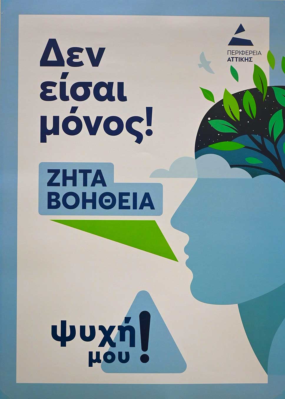 Η Περιφέρεια Αττικής, λοιπόν, ενώνει τις δυνάμεις της για την ευαισθητοποίηση και την πρόληψη της ψυχικής υγείας με σειρά από ομιλίες και δράσεις για την πρώιμη παρέμβαση. Η ψυχική υγεία ανήκει σε όλους μας και πρέπει να εξασφαλίσουμε την πρόσβαση σε φροντίδα για όλους, ανεξαρτήτως κοινωνικής ή οικονομικής κατάστασης. Είμαστε αφοσιωμένοι στη στήριξη των χρόνιων ψυχικά πασχόντων και την καταπολέμηση του στίγματος που αφορά τις ψυχικές διαταραχές».