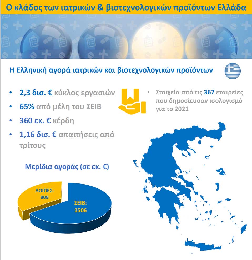 Ο Σύνδεσμος Επιχειρήσεων Ιατρικών και Βιοτεχνολογικών Προϊόντων (Σ.Ε.Ι.Β.) παρουσίασε τα αποτελέσματα Ειδικής Μελέτης για τον ρόλο και το αποτύπωμα του κλάδου, η οποία πραγματοποιήθηκε από το Ινστιτούτο Πολιτικής Υγείας (Ι.Π.Υ.) για λογαριασμό του Συνδέσμου. Το αντικείμενο της Ειδικής Μελέτης αφορά στην καταγραφή της υφιστάμενης κατάστασης και τις προοπτικές της αγοράς των ιατρικών και βιοτεχνολογικών προϊόντων στην Ελλάδα. Στη διάρκεια της εκδήλωσης συζητήθηκαν και απόψεις εκπροσώπων της επιστημονικής κοινότητας και της Ένωσης Ασθενών.